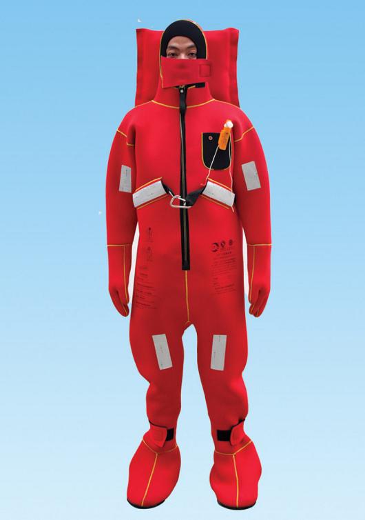 DBF-II 型救生服是按 SOLAS 公約IMO 規(guī)范的要求制造的,具有水密、浮力和自然保溫功能,配有哨笛和救生衣燈,不需要加穿救生衣。